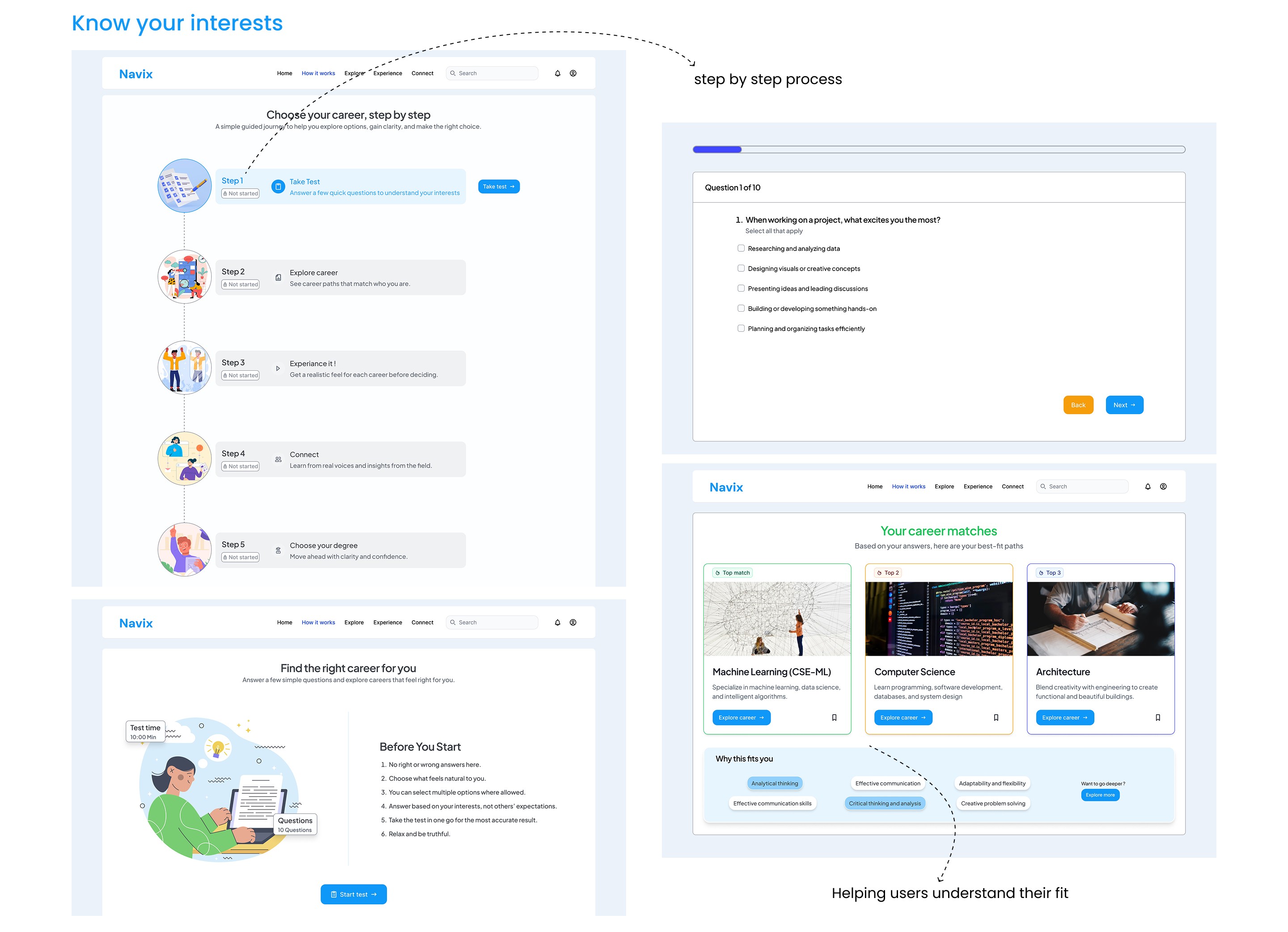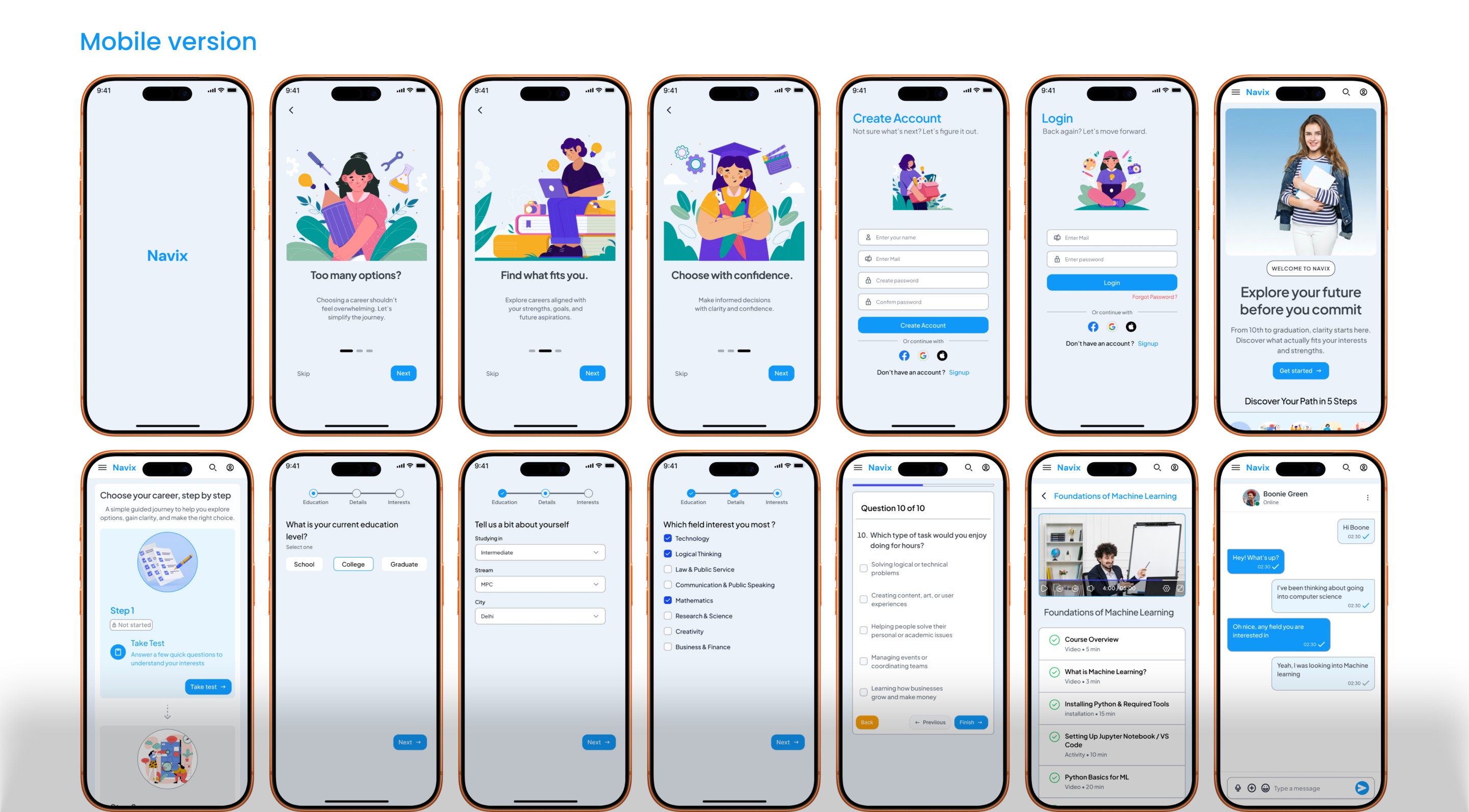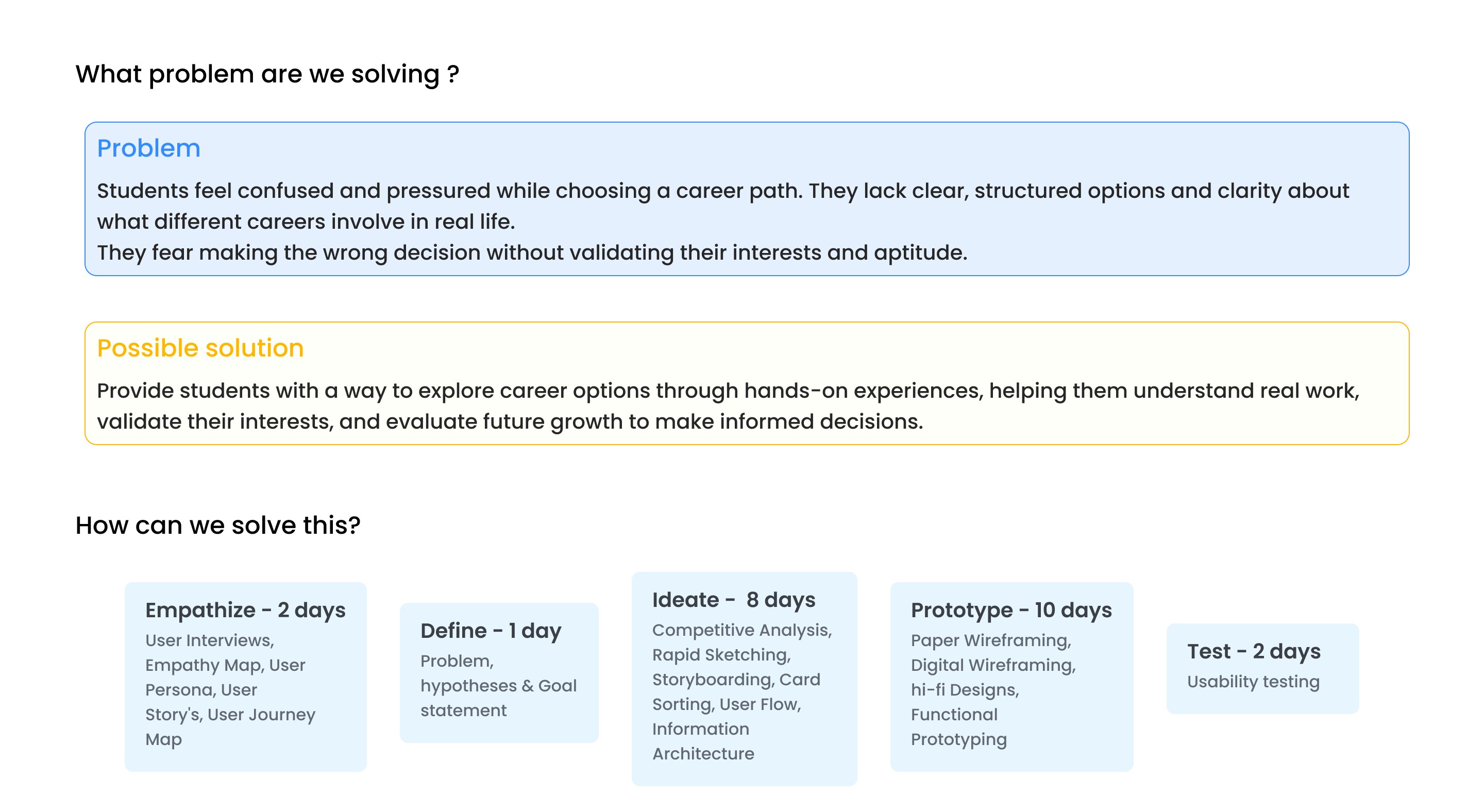 Students often feel overwhelmed and uncertain when choosing a career due to a lack of clarity and real-world understanding. Navix addresses this by enabling hands-on exploration of career paths, helping students validate their interests and make more informed decisions.